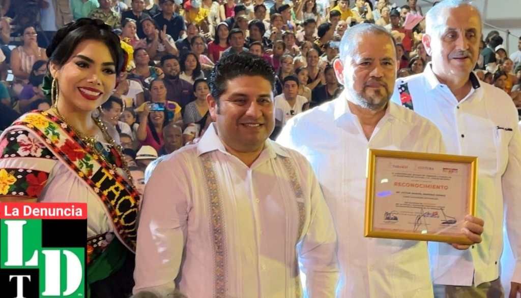 El alcade Ricki Antonio Arcos Pérez y el Gobernador Carlos Manuel Merino Campos, entregaron este galardón previo a la participación cultural del municipio serrano en la máxima fiesta de los tabasqueños.