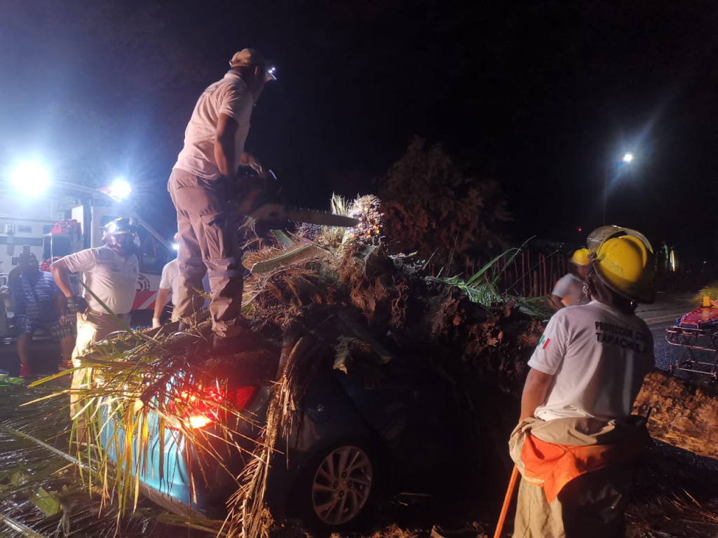Asimismo se brindó atención a una persona que viajaba en su automóvil en el libramiento sur poniente cuando le cayó una palmera, por tal situación con el apoyo de motosierras se liberó el vehículo para poder atender a la mujer de 43 años de edad quien resultó con algunas lesiones por lo que fue trasladada a una unidad de emergencia.