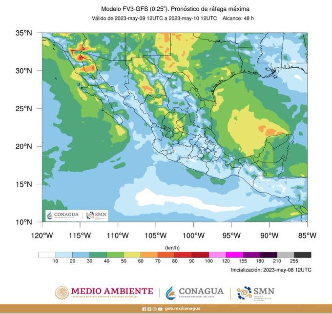 El frente frío Núm. 54 se desplazará sobre el noroeste y norte del país, interaccionará gradualmente con la línea seca y con inestabilidad en niveles altos de la atmósfera, provocando lluvias con intervalos de chubascos, tormentas eléctricas, granizo y probable formación de torbellinos o tornados en Coahuila, Nuevo León y Tamaulipas.