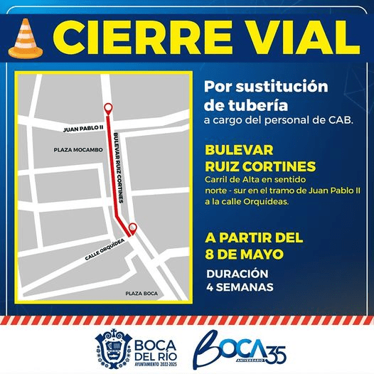 La vialidad estará afectada desde la calzada Juan Pablo Segundad hasta la calle Orquídeas, en el fraccionamiento Jardines de Virginia; se prevé que los trabajos tengan una duración de 4 semanas.