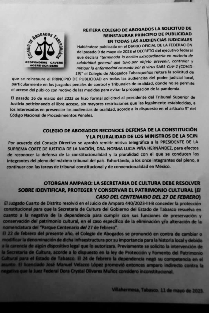 El 22 de febrero del presente año, el Colegio de Abogados se pronunció en contra de cambiar o modificar la denominación de dicha infraestructura por su importancia para la historia local y debido a la carencia de algún dispositivo legal que lo autorizara. Previamente se solicito la intervención de la Secretaria de Cultura, acorde a lo dispuesto en la ley de Protección y Fomento del Patrimonio Cultural para el Estado de Tabasco. El 24 de febrero la dependencia negó su competencia en el asunto. El licenciado José Manuel Velazco López promovió entonces amparo indirecto contra la negativa que la Juez Federal Dora Crystal Olivares Muñoz considero inconstitucional.