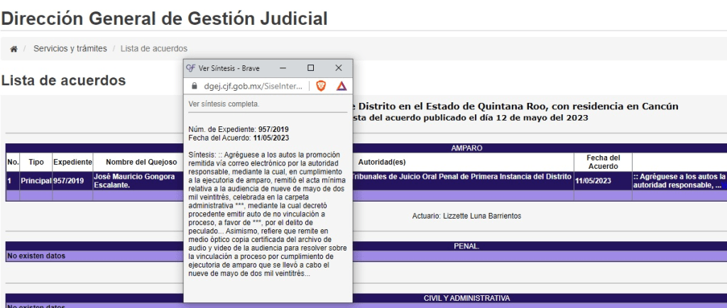 La defensa del ex edil recurrió al amparo, mismo que fue resuelto a su favor por el juzgado séptimo de distrito del circuito que corresponde a Quintana Roo, con sede en Cancún, mismo que ya recibió una copia de esta audiencia y del auto de no vinculación a proceso, como constancia de que se había dado cumplimiento a lo ordenado.