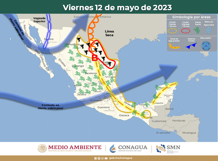 Finalmente, continuará la segunda onda de calor sobre gran parte del territorio nacional, con ambiente caluroso a muy caluroso y temperaturas máximas superiores a 40 °C en zonas de San Luis Potosí, Michoacán, Guerrero, Oaxaca, Chiapas, Veracruz, Tabasco, Campeche y Yucatán.