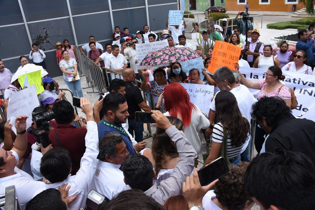 Con pancartas en mano y al grito unísono de ‘diálogo’ y ‘gobernadora’, los manifestantes esperaron a que Sansores saliera del recinto legislativo, por lo que al verse acorralada y presionada, tuvo que atenderlos, ofreciendo que una comisión sería recibiría por el secretario de Gobierno, el chiapaneco Aníbal Ostoa Ortega.