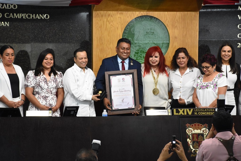 El Congreso del Estado entregó el premio “Mérito a la Enfermería Campechana” edición 2023 al teniente de fragata enfermero táctico paracaidista, Carlos Fuentes Hernández, y al doctor en enfermería, Alberto Tafoya Ramírez, en las categorías de Servicios y Administración, y Académica, respectivamente.
