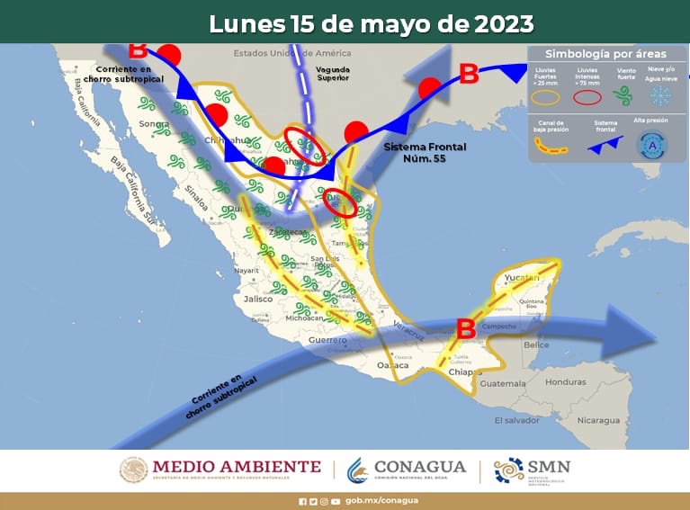 Por otro lado, dos canales de baja presión, el primero se localizará sobre el occidente, centro y sur del territorio nacional, y el segundo sobre el sureste mexicano y la Península de Yucatán, los cuales en combinación con la corriente en chorro subtropical, divergencia en altura e ingreso de humedad del Océano Pacífico, Golfo de México y Mar Caribe, ocasionarán chubascos y lluvias fuertes acompañadas de descargas eléctricas, rachas de viento y posible caída de granizo sobre las regiones mencionadas, además del oriente del país.