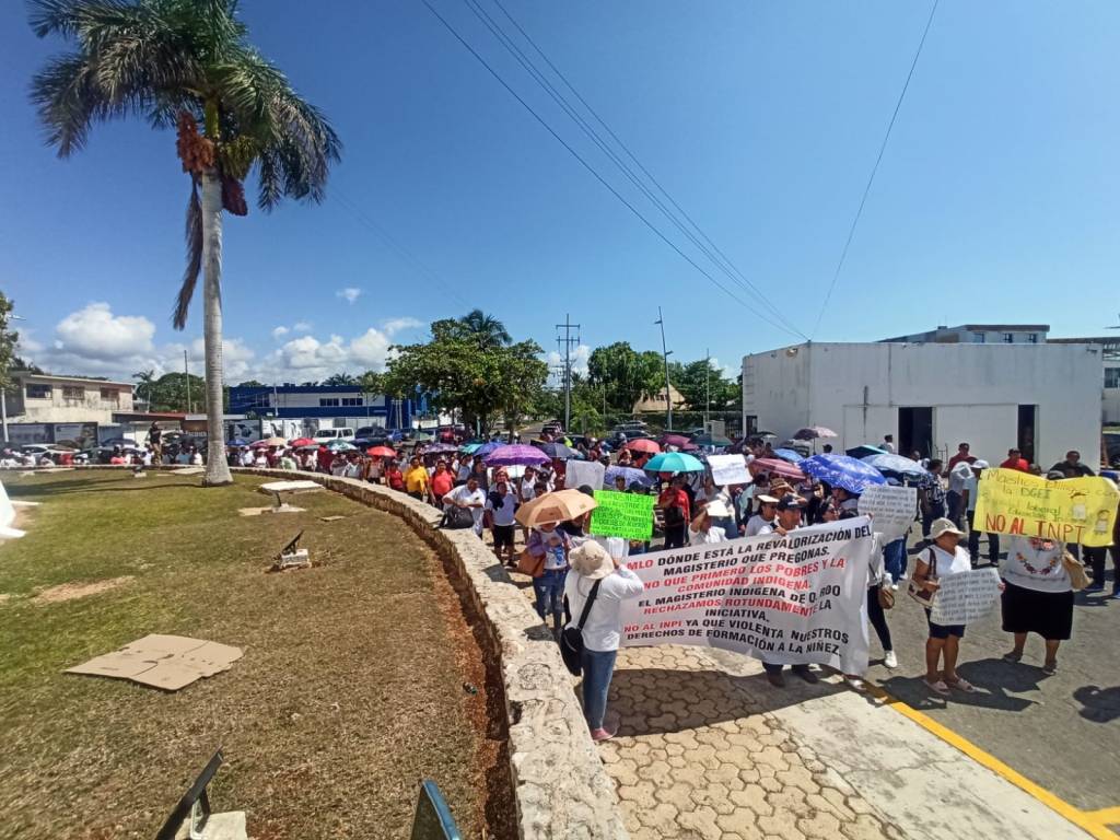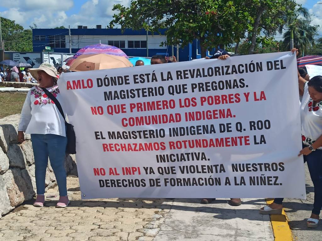 Un grupo cercano a 100 maestros de educación indígena, provenientes de varios puntos de Quintana Roo, se manifestaron esta mañana afuera de la sede del Gobierno del Estado y después en el Congreso local, para protestar la iniciativa federal para incorporarlos al Instituto Nacional de Pueblos Indígenas (INPI).