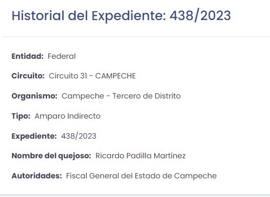 Igual trascendió que hasta el momento, el Ministerio Público de la Fiscalía General de Justicia del Estado de Campeche (Fgecam), aún están en la integración de la carpeta de investigación para judicializarla, por lo cual hasta ahora no hay la petición de orden de aprehensión contra Ricardo Padilla.