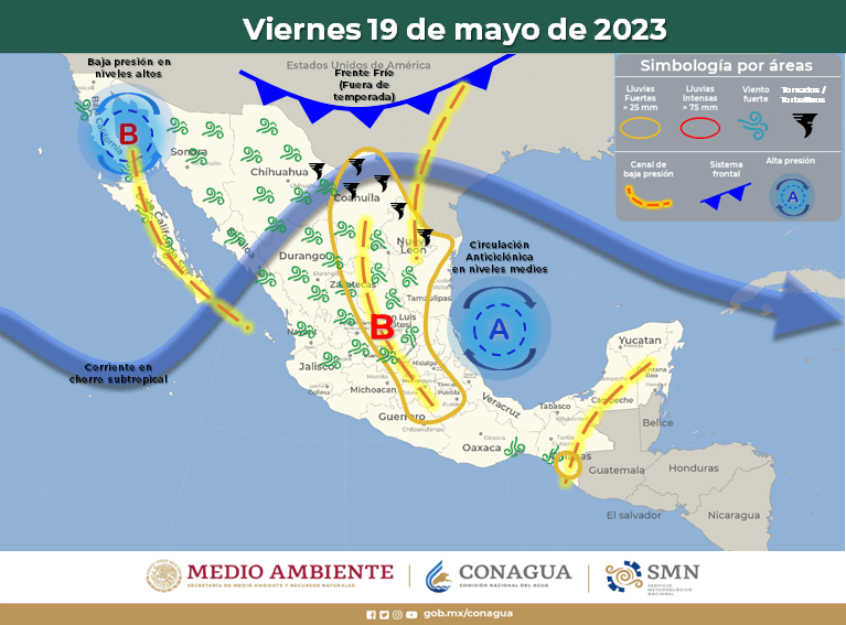 Así mismo, continuará la interacción de canales de baja presión, uno sobre el norte, centro y sur del país, y el segundo sobre la Península de Yucatán y el Sureste Mexicano, ambos en combinación con la entrada de humedad del Océano Pacífico y Golfo de México generarán lluvias en las regiones mencionadas.