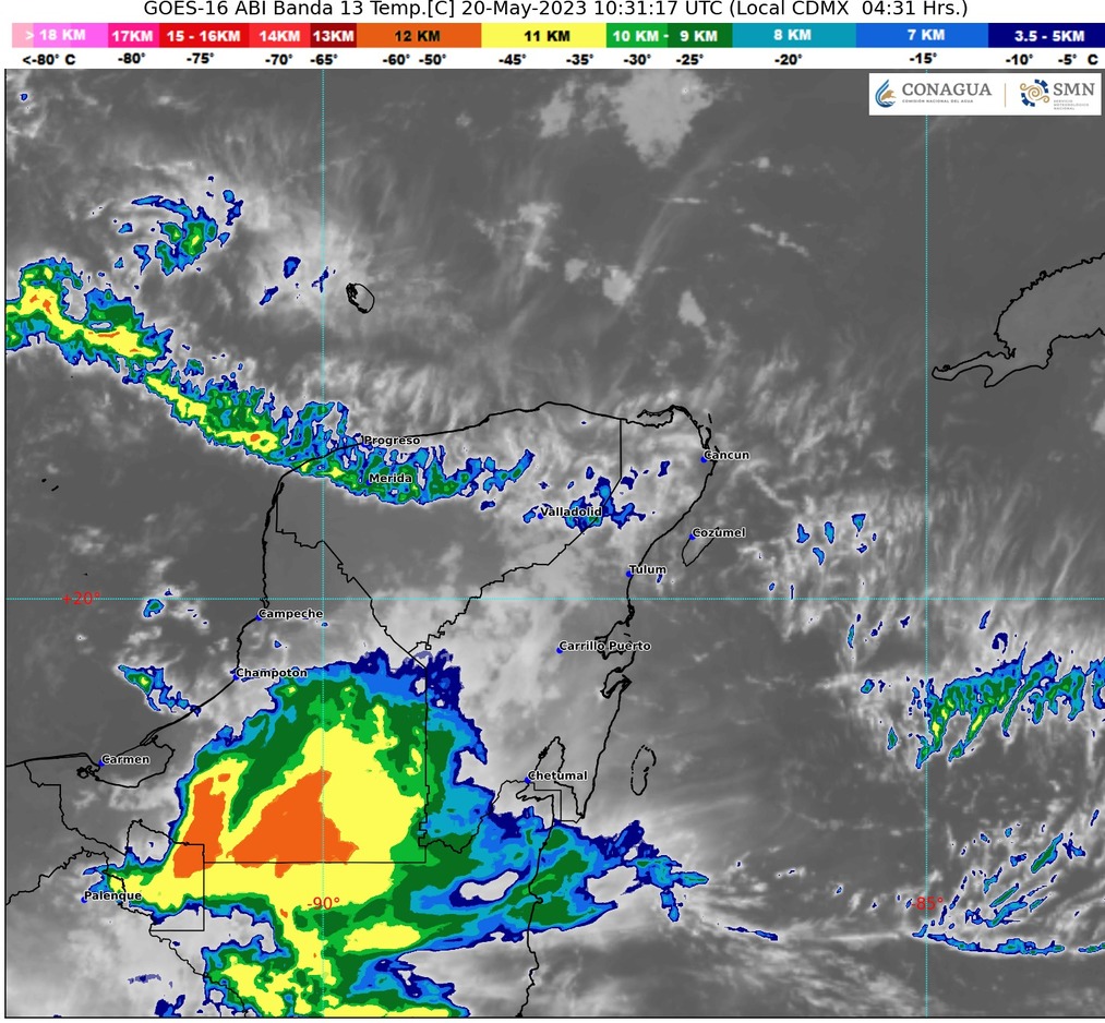 Para la Península de Yucatán el SMN pronostica cielo con nubes dispersas por la mañana y medio nublado por la tarde con intervalos de chubascos y descargas eléctricas en la región; ambiente cálido durante la mañana y caluroso a muy caluroso por la tarde; viento de componente este de 10 a 30 km/h con rachas de hasta 40 km/h en la región.