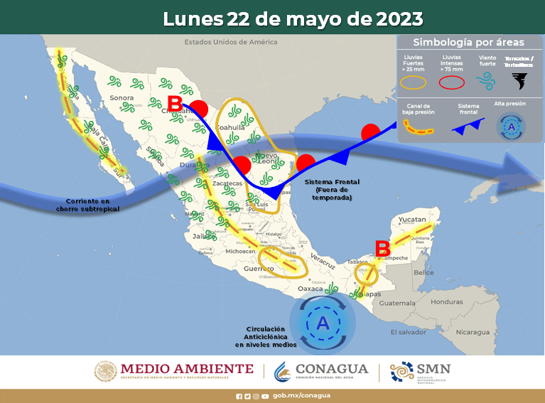 El sistema frontal (fuera de temporada) se extenderá como estacionario sobre el norte y noreste de la República Mexicana, en interacción con un canal de baja presión que se localizará sobre el centro, occidente y sur del territorio nacional, la corriente en chorro subtropical y divergencia en altura, ocasionarán chubascos y lluvias fuertes acompañadas de descargas eléctricas, rachas de viento y posible caída de granizo en dichas regiones, además del oriente del país.
