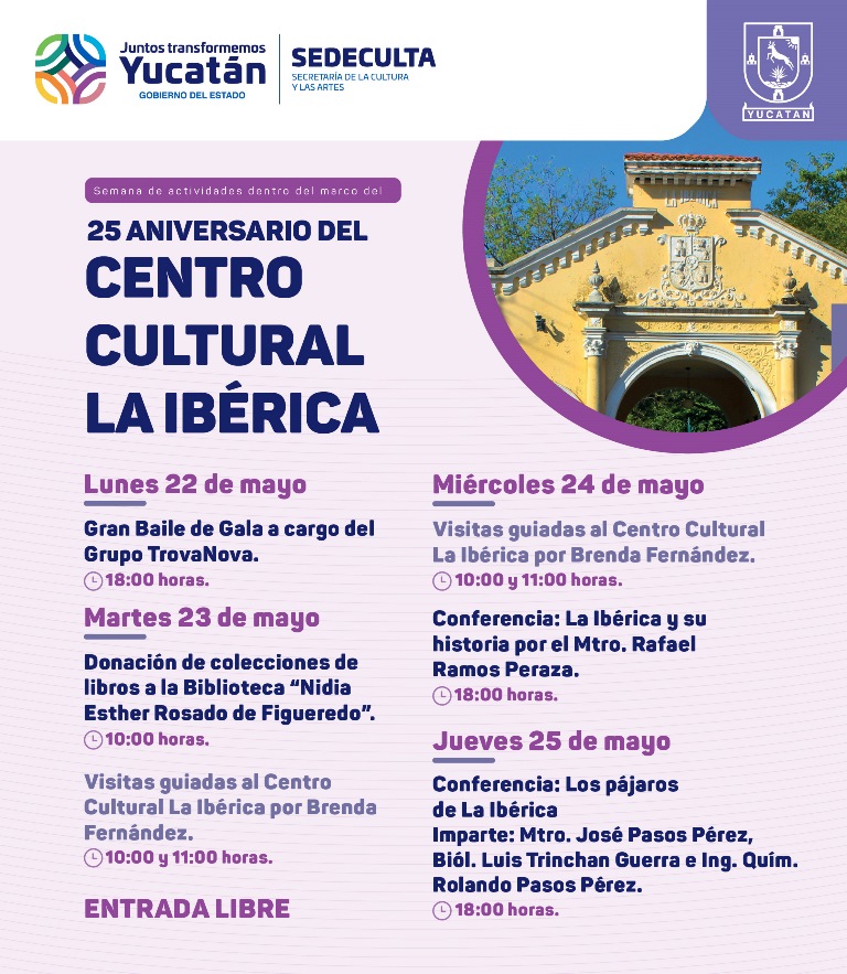 Con un concierto de música popular, la donación de textos, conferencias y visitas guiadas el Centro Cultural “La Ibérica” celebrará 25 años de fomentar y ofrecer actividades recreativas a las personas adultas mayores, como parte del objetivo del Gobernador Mauricio Vila Dosal, de acercar los bienes y servicios del ramo a la población de todas las edades.