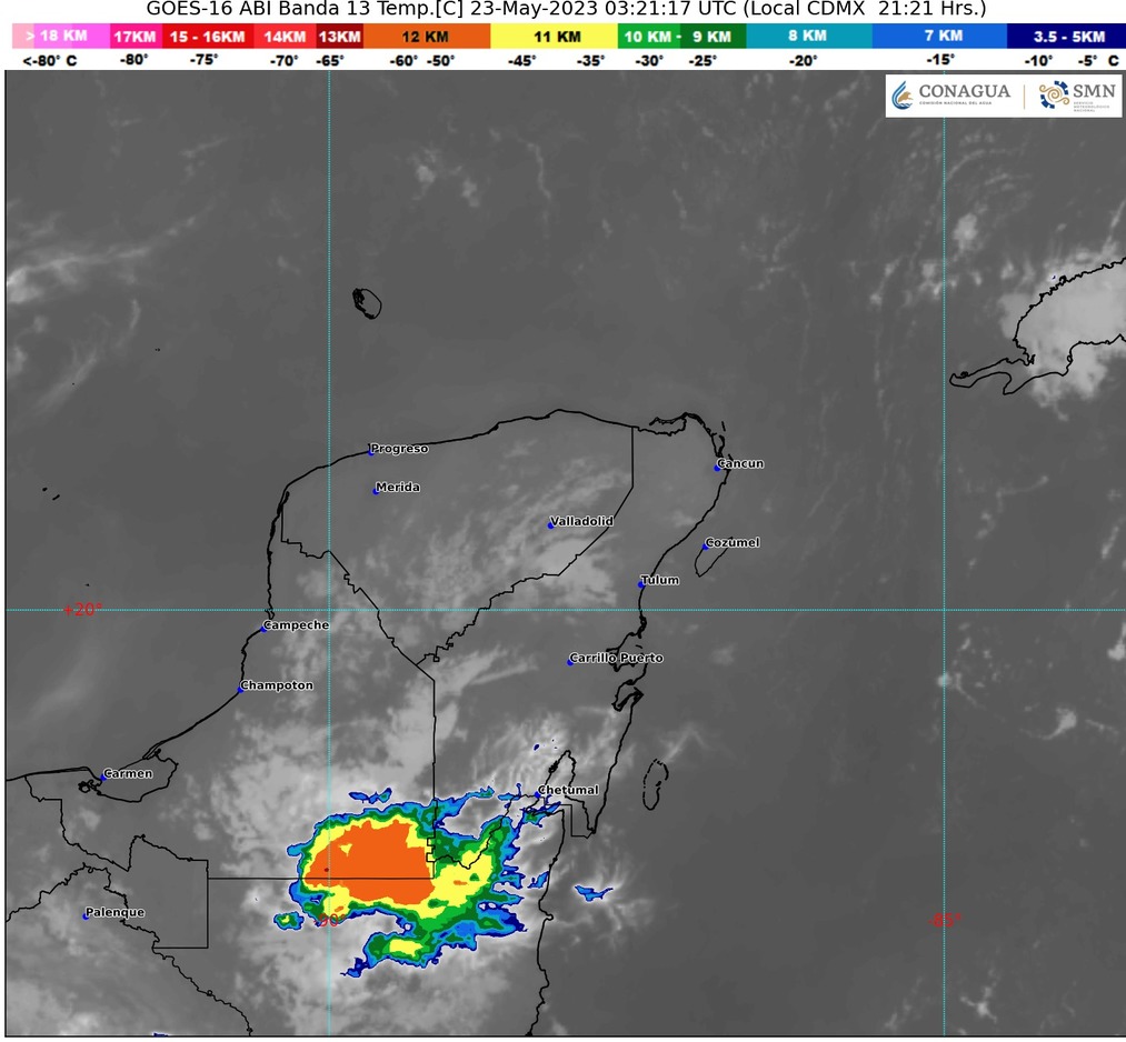 El pronóstico del tiempo para la Península de Yucatán es de cielo medio nublado a nublado durante el día, con lluvias e intervalos de chubascos en Campeche y Quintana Roo, y lluvias aisladas en Yucatán.
