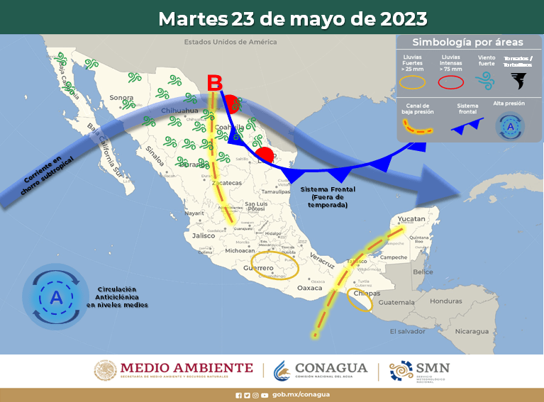 El sistema frontal (fuera de temporada) se extenderá con características de estacionario sobre la República Mexicana, interaccionará con un canal de baja presión sobre la Mesa del Norte y con la corriente en chorro subtropical, ocasionando chubascos y lluvias fuertes acompañadas de descargas eléctricas y posible caída de granizo en dichas regiones, además de rachas de viento en el noroeste y norte del país.