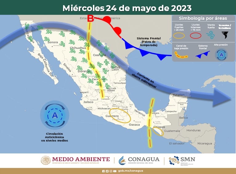 Asimismo, un segundo canal de baja presión se extenderá sobre la Mesa del Norte, interaccionará con la corriente en chorro subtropical, ocasionando lluvias y chubascos, descargas eléctricas y posible caída de granizo en la mencionada región, además de rachas de viento en el noroeste y norte de la República Mexicana.