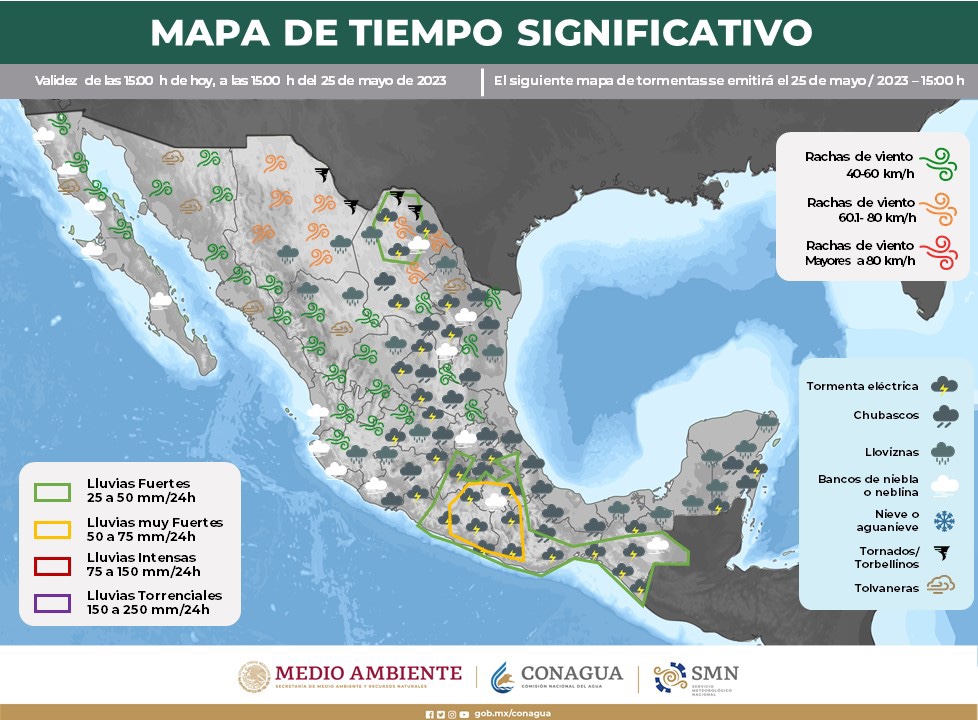 Finalmente, continuará el ambiente caluroso a muy caluroso sobre entidades del litoral del Pacífico Mexicano, oriente y sureste del país, así como en la Península de Yucatán, con temperaturas máximas superiores a 40 °C en zonas de Sinaloa, Nayarit, Jalisco, Colima, Michoacán, Guerrero, Campeche y Yucatán.