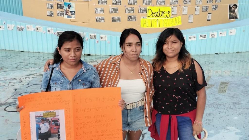 Cancún.- Esta tarde, alrededor de 10 jóvenes mujeres colgaron un «tendedero» de fotos y cartulinas para exhibir a sus padres deudores alimentarios, esto en la glorieta «El Ceviche» de esta ciudad.