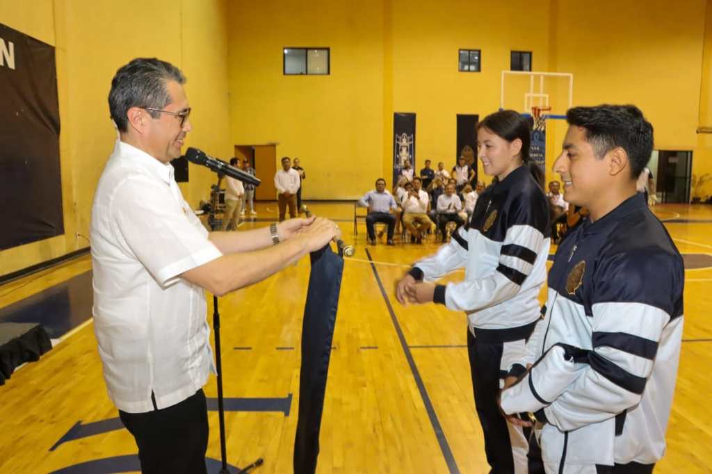 En esta ceremonia el rector Estrada Pinto entregó el banderín representativo a Karina Sánchez y a Mauricio Burgos Chan estudiantes de la Facultad de Medicina, la primera medallista de plata en Karate y el segundo medallista de bronce en levantamiento de pesas, ambos en la Universiada Nacional 2022.
