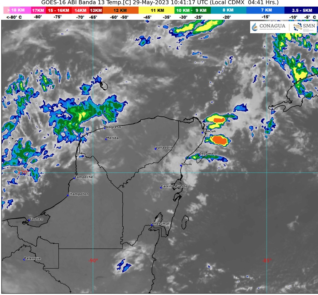 El Servicio Meteorológico Nacional (SMN) informó que en la Península de Yucatán habrá cielo con nubes dispersas por la mañana y nublado por la tarde con chubascos y descargas eléctricas en Yucatán, Campeche y Quintana Roo; ambiente templado durante la mañana y muy caluroso por la tarde en la región; viento de componente norte de 10 a 25 km/h con rachas de hasta 40 km/h.