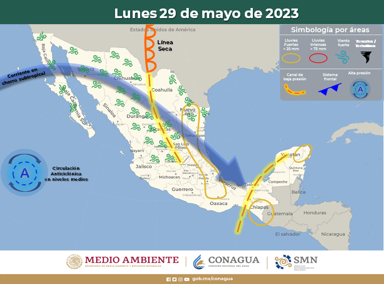 Por otra parte, un canal de baja presión en el sureste mexicano y la Península de Yucatán aunado al ingreso de humedad del Golfo de México y Mar Caribe, generarán lluvias y chubascos vespertinos con posibles descargas eléctricas en dichas regiones, pronosticándose lluvias puntuales muy fuertes en Chiapas. // Por: Agencia SIM
