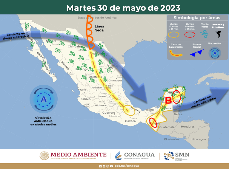 Por su parte, canales de baja presión se extenderán sobre la Mesa del Norte, la Mesa Central, el oriente del país y la Península de Yucatán, aunados al ingreso de humedad del Océano Pacífico, Golfo de México y Mar Caribe, generarán chubascos y lluvias fuertes acompañadas de descargas eléctricas, rachas de viento y posible caída de granizo en las regiones mencionadas.