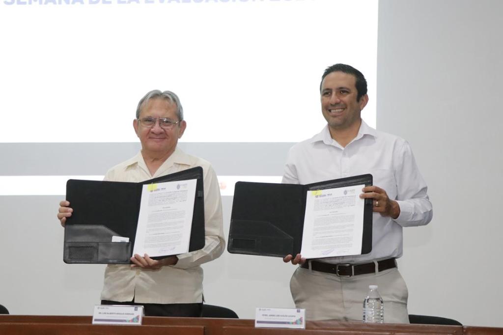 Previo a esta mesa panel, el director de la Facultad de Economía, Luis Alberto Araujo Andrade y el titular de la Secretaría Técnica de Planeación del Gobierno del Estado (Seplan), Jorge Luis Avilés Lizama, firmaron un convenio de colaboración que permitirá fortalecer la formación de los estudiantes de la Maestría en Políticas Públicas.
