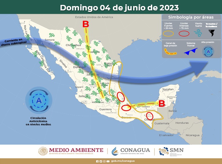 Finalmente, una circulación anticiclónica en niveles medios de la atmósfera mantendrá la tercera onda de calor sobre el territorio nacional, con temperaturas máximas por arriba de 30 °C en los 32 estados del país, pronosticándose temperaturas superiores a los 40 °C en zonas de Baja California, Sonora, Sinaloa, Nayarit, Jalisco, Colima, Michoacán, Guerrero, Morelos, Oaxaca, Chiapas, Veracruz, Tabasco, Campeche, Yucatán y Quintana Roo.