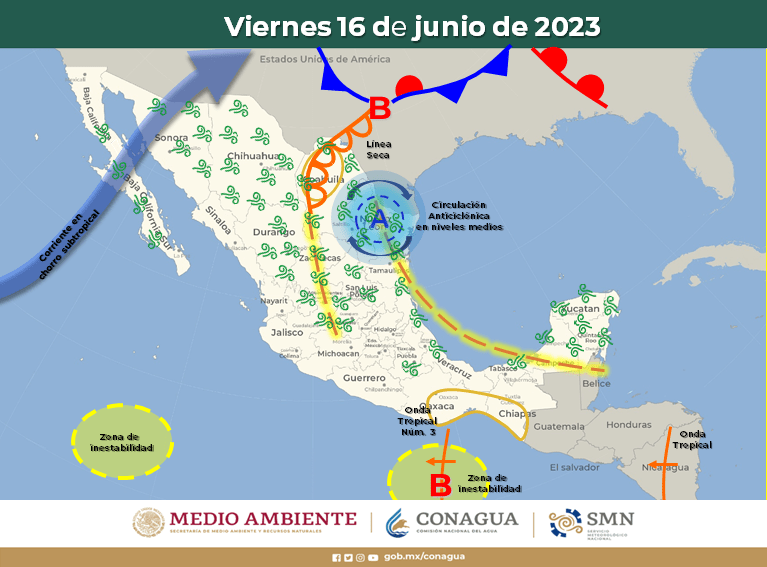 Asimismo, una línea seca en el norte del país, en interacción con la corriente en chorro subtropical, ocasionarán vientos fuertes con posibles tolvaneras sobre el noroeste, norte y noreste de México.