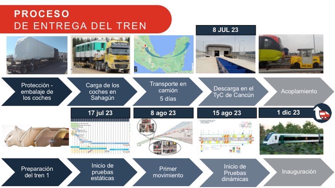 Asimismo, el proceso para la entrega del primer tren del Tren Maya comenzará con el embalaje de los coches y su traslado de las instalaciones de la empresa Alstom Develops & Markets en Hidalgo a la Cochera en Cancún, donde se acoplará para las pruebas antes de la inauguración en diciembre.