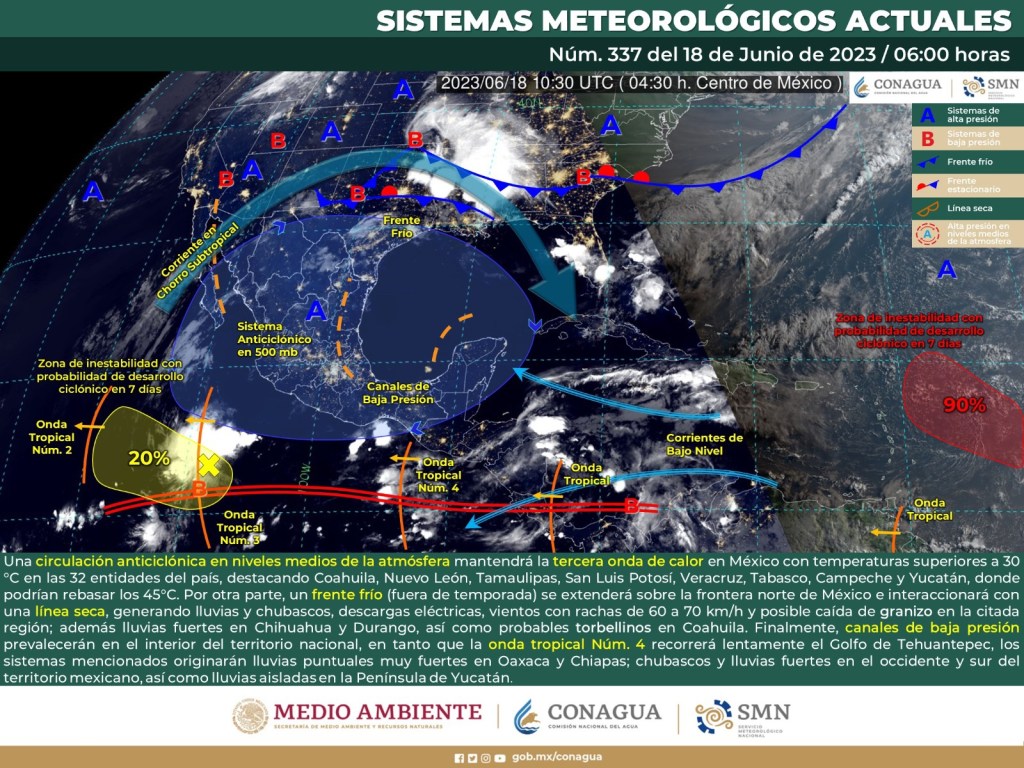 Finalmente, canales de baja presión prevalecerán en el interior del territorio nacional, en tanto que la onda tropical Núm. 4 recorrerá lentamente el Golfo de Tehuantepec.