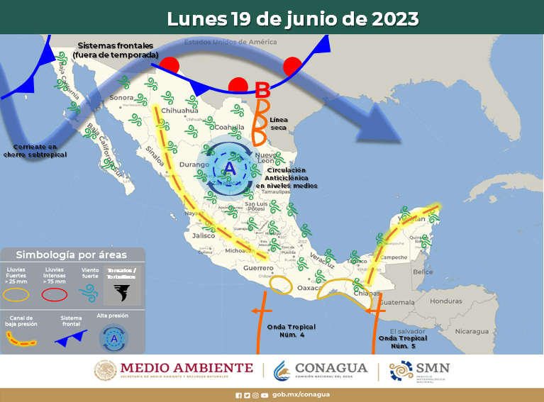 Finalmente, la nueva onda tropical (Núm. 5) se desplazará sobre el Golfo de Tehuantepec, propiciando lluvias fuertes a muy fuertes con descargas eléctricas y rachas de viento en Oaxaca y Chiapas. Mientras que la onda tropical Núm. 4 se desplazará al sur de las costas de Guerrero y Michoacán, originando chubascos y lluvias fuertes en ambas entidades.