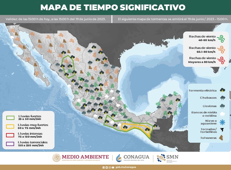 Para la Península de Yucatán habrá cielo despejado a medio nublado con lluvias aisladas en Campeche y Quintana Roo, sin lluvia en Yucatán. Ambiente cálido por la mañana y extremadamente caluroso por la tarde. Viento de componente sur de 15 a 30 km/h con rachas de 40 a 60 km/h en la península.