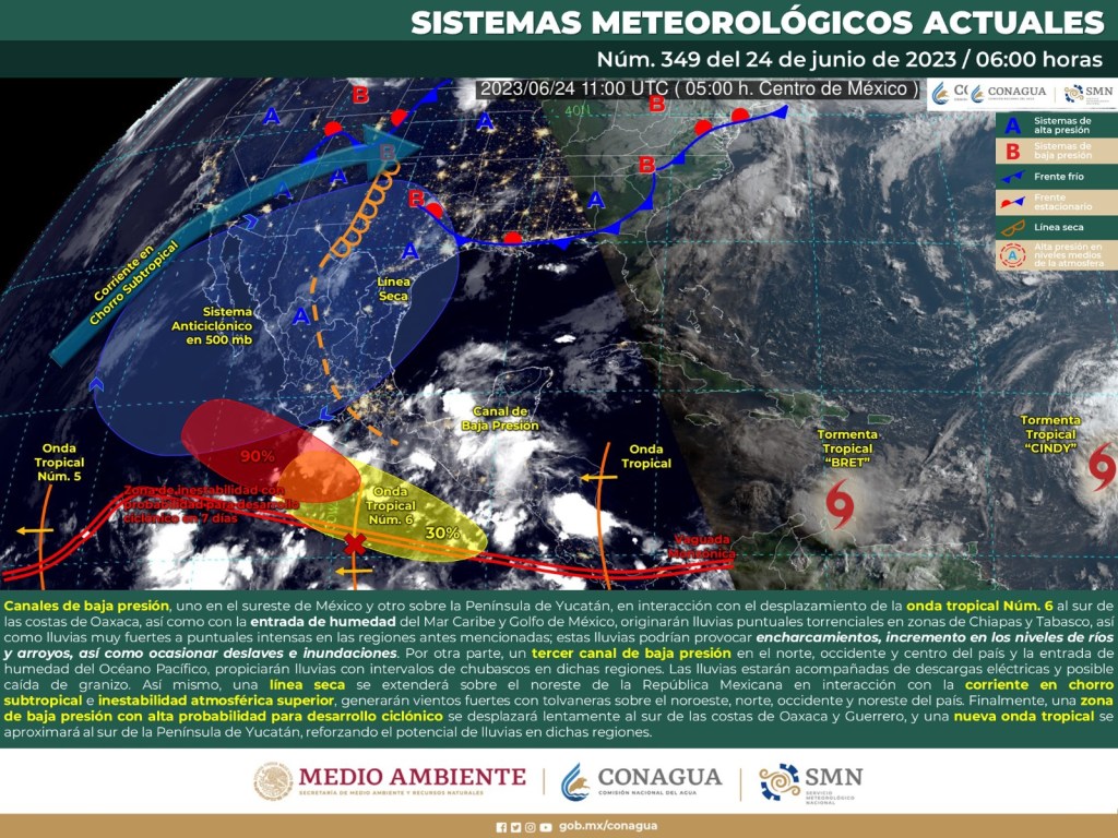 Por otra parte, un tercer canal de baja presión en el norte, occidente y centro del país y la entrada de humedad del Océano Pacífico, propiciarán lluvias con intervalos de chubascos en dichas regiones.
