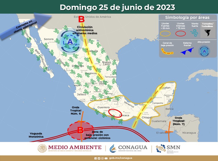 Asimismo, un canal de baja presión sobre el norte del país, en interacción con la corriente en chorro subtropical y divergencia en altura, generarán vientos fuertes con tolvaneras en el noroeste, norte y noreste del territorio nacional, así como lluvias y chubascos vespertinos, descargas eléctricas y posibles granizadas en Sonora, Chihuahua, Durango y Sinaloa.