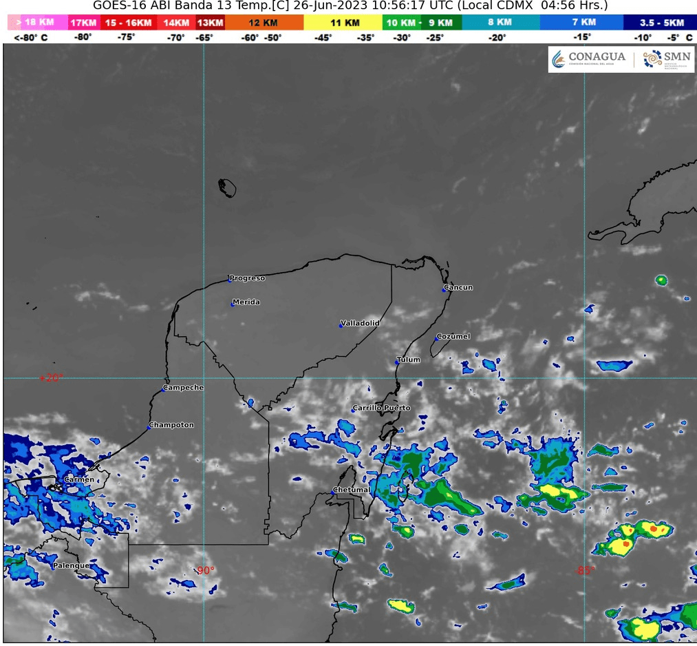 Para la Península de Yucatán habrá cielo medio nublado a nublado la mayor parte del día con probabilidad de lluvias puntuales muy fuertes en Campeche y Yucatán; ambiente cálido por la mañana y caluroso por la tarde; viento de componente este de 10 a 25 km/h con rachas de hasta 60 km/h en Campeche y Yucatán.