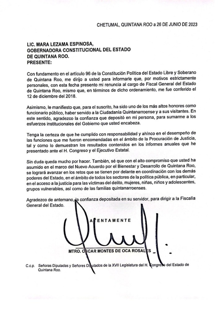 “Con fundamento en el artículo 96 de la Constitución Política del Estado Libre y Soberano de Quintana Roo, me dirijo a usted para informarle que, por motivos estrictamente personales, con esta fecha presento mi renuncia al cargo de Fiscal General del Estado de Quitnana Roo”, inicia la carta firmada por Montes de Oca, dirigida a la gobernadora Mara Lezama Espinosa.