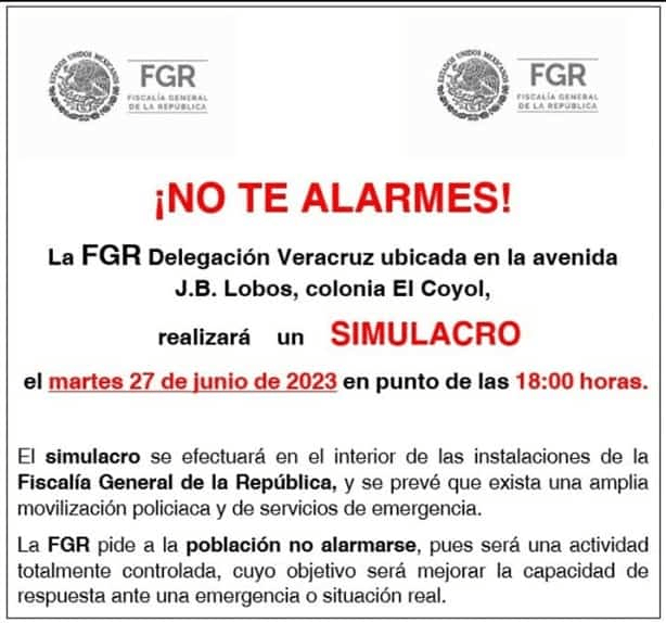 Esta acción se deberá a un simulacro que efectuarán elementos de la FGR en sus instalaciones que se encuentran ubicadas en la avenida J. B. Lobos, de la colonia El Coyol, en el puerto de Veracruz.