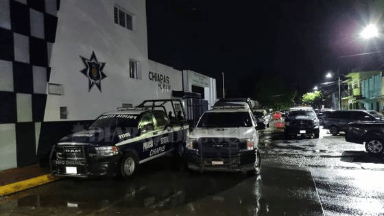 Peritos de la Fiscalía de Distrito Fronterizo acudieron al lugar para realizar las investigaciones, mientras tanto elementos del Ejército Mexicano recorren las calles aledañas a la Secretaría de Seguridad Pública y Protección Ciudadana del sector V. // Tomado de: Heraldo de Chiapas
