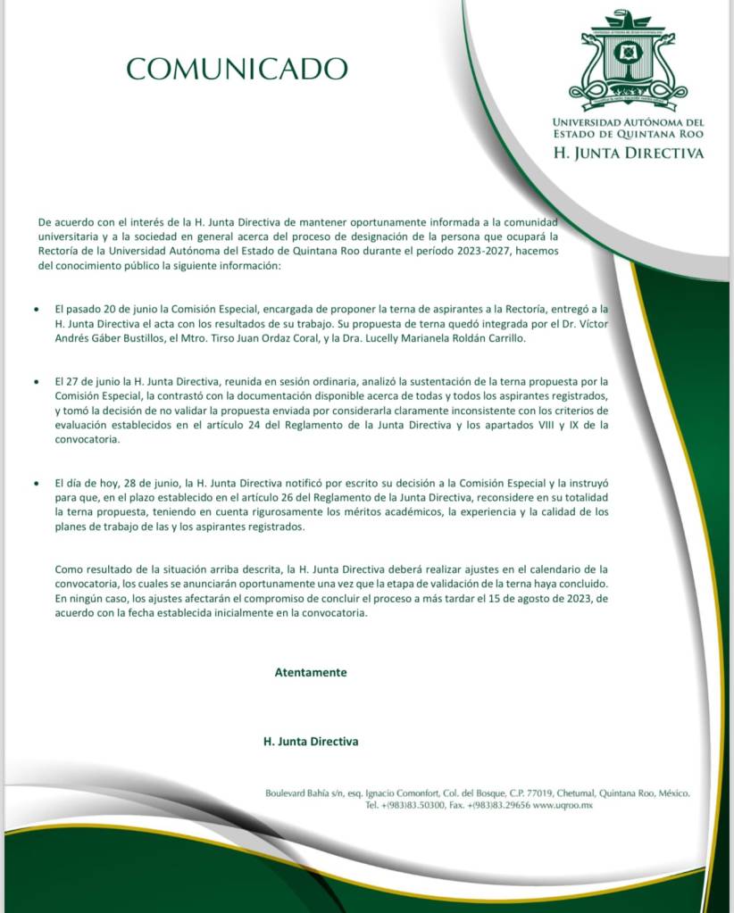 A través de un documento de una cuartilla, los encargados del proceso interno de la Uaqroo, informaron que tendrán que analizar a detalles los expedientes de los tres aspirantes al cargo (Vícto Gáber Bustillos, Lucelly Roldan Carillo y Tirso Ordaz Coral) ya que no cumplen con los apartados VIII y IX de la convocatoria, que refiere los méritos académicos, la experiencia y la calidad de los planes de trabajo.