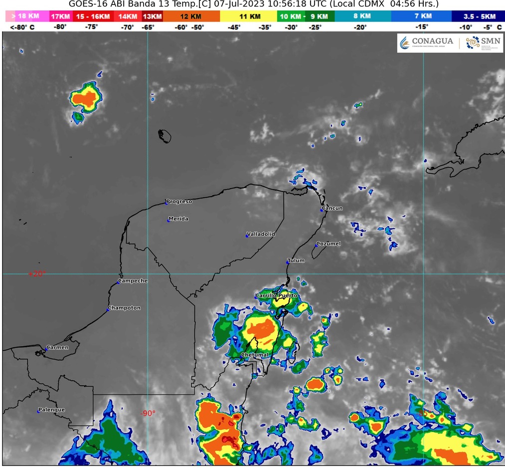 El pronóstico del tiempo para la Península de Yucatán es de cielo nublado durante el día, con lluvias puntuales muy fuertes en Campeche, y fuertes en Yucatán y Quintana Roo, acompañadas de descargas eléctricas y posible caída de granizo.