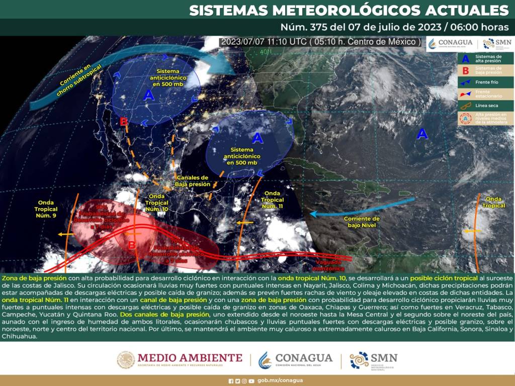 Por su parte, la onda tropical Núm. 11 se aproximará a la Península de Yucatán y en interacción con un canal de baja presión en el sureste de México, propiciará lluvias muy fuertes a puntuales intensas en Chiapas y Oaxaca, y lluvias fuertes en Tabasco y en dicha península, además de rachas de viento, descargas eléctricas y posible caída de granizo.