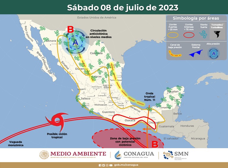 Por otra parte, la onda tropical Núm. 11 se desplazará por el sureste mexicano y se asociará con una zona de baja presión con probabilidad de desarrollo ciclónico al sur de las costas de Chiapas y Oaxaca.