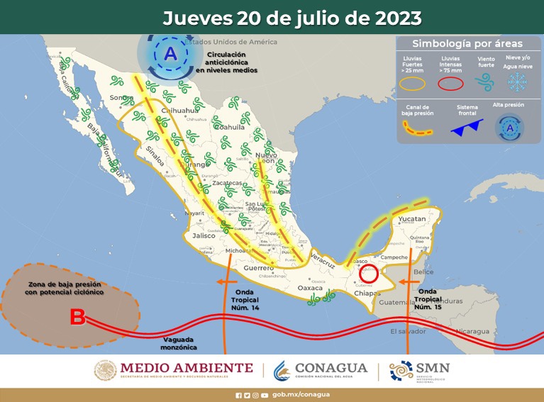 Dicha onda tropical recorrerá la Península de Yucatán y el sureste mexicano, en interacción con otro canal de baja presión sobre la Sonda de Campeche, generará lluvias fuertes a muy fuertes acompañadas de descargas eléctricas, rachas de viento y posible caída de granizo en las regiones mencionadas, pronosticándose lluvias puntuales intensas en Chiapas y Tabasco.
