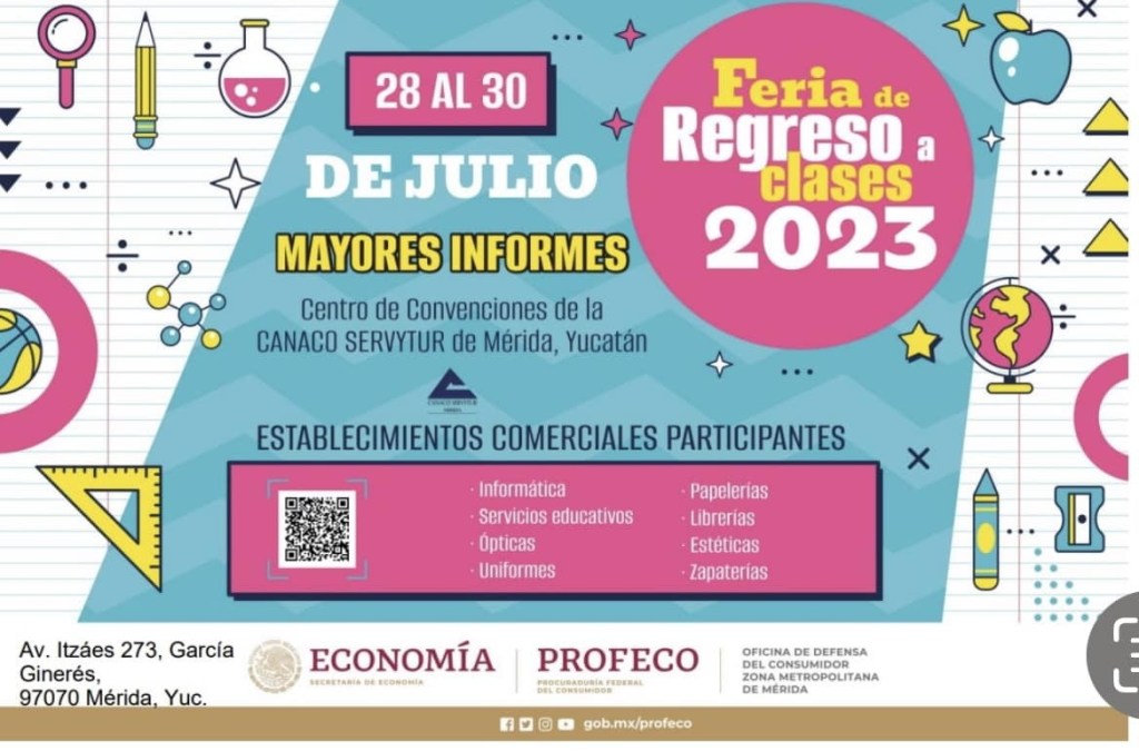 También aprovechó el llamado para invitar a los padres de familia a acudir a comparar precios, y de así decidirlo comprar la lista de útiles en la “Feria del regreso a clases 2023” organizada por la Procuraduría Federal del consumidor que se realizará del 28 al 30 de julio en las instalaciones de la Canaco Servytur de Mérida en un horario de 10 de la mañana a 7 de la noche, y en donde habrá más de 20 establecimientos que ofrecerán uniformes, zapatos, útiles escolares, ópticas, accesorios, mochilas y productos de cómputo.