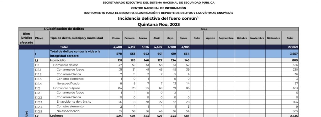 Durante junio, Quintana Roo tuvo una incidencia diaria de 166 actos delictivos, de acuerdo al Secretariado Ejecutivo del Sistema Nacional de Seguridad Pública (Sesnsp) y en acumulado mensual fue de 4 mil 983 reportes delictuosos.