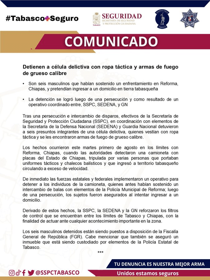 Este martes 1 de agosto de 2023 una célula delictiva cayó en tierras tabasqueñas, no sin antes ocurrir una persecución y sostener un intercambio de balas contra fuerzas de los distintos órdenes de gobierno, informó la Secretaría de Seguridad y Protección Ciudadana de Tabasco (SSPCT).