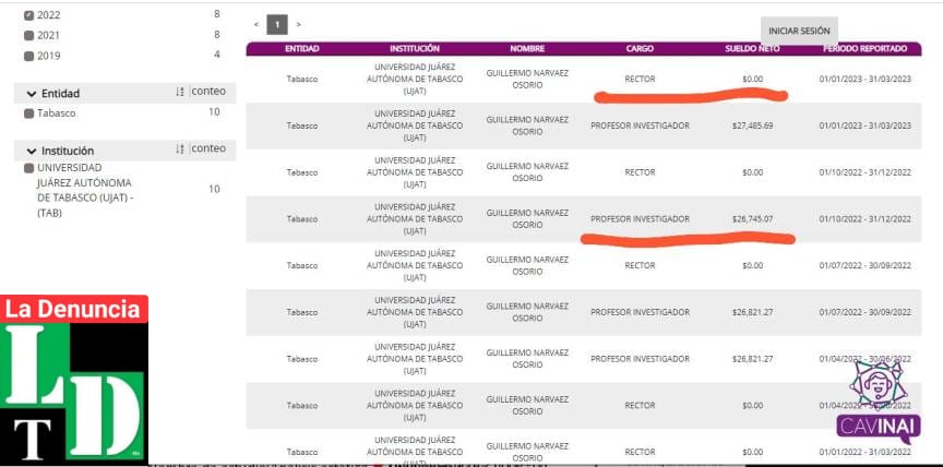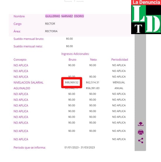 Por si esto ya no fuera suficiente, Narváez Osorio ni siquiera declara oficialmente que gana como Rector, ya que las pruebas aquí mostradas dicen claramente que como Rector recibe cero pesos, pero la realidad es que se embolsa $89,000.00; y en todos estos años (21,22 y 23) cobra sin trabajar como Profesor Investigador la suma de $36,000.00.