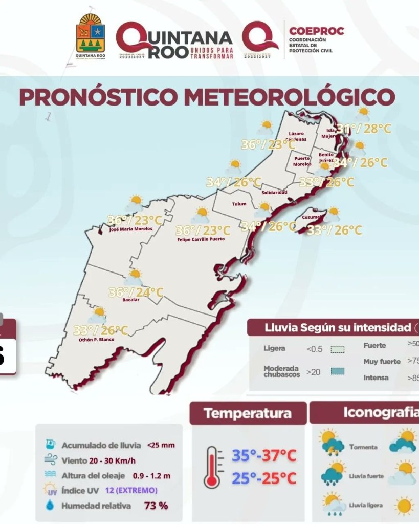 Detalla que podrían presentarse lluvias y chubascos dispersos acompañadas de actividad eléctrica sobre algunas zonas del Estado de Quintana Roo, las temperaturas serán muy calurosas a bochornosas durante el transcurso del día y cálidas a calurosas por la noche y madrugada sobre el Estado.