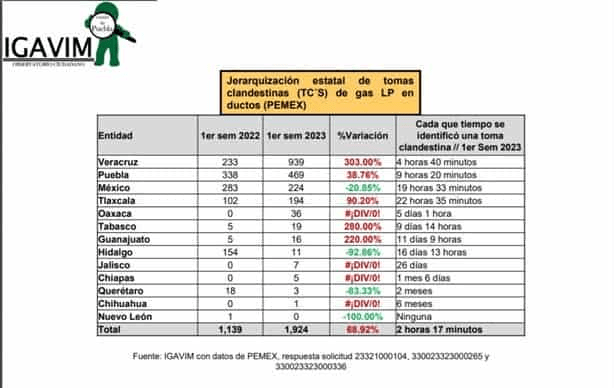 Según el reporte del IGAVIM, el estado de Veracruz registra casi la mitad de las mil 924 tomas clandestinas en ductos de Gas LP en el país durante el primer semestre del 2023, con un total de 939.