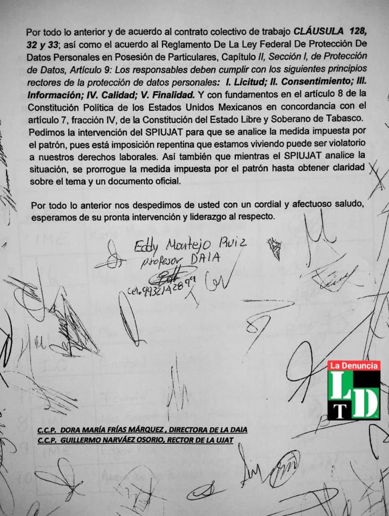 Agencia IDMx// Villahermosa, Tabasco; a 16 de agosto._ Estalla conflicto en la Universidad Juárez Autónoma de Tabasco; profesores investigadores denuncian graves violaciones al Contrato Colectivo de Trabajo, de parte del Rector Guillermo Narváez Osorio; los Académicos se oponen a proporcionar sus datos biométricos que de forma forzada les están exigiendo entreguen; ya solicitaron la intervención de su líder del Sindicato de Profesores. Filtran que de no dar marcha atrás a este abuso, habrá paro laboral este inicio de ciclo escolar que arranca el lunes 21 de agosto.